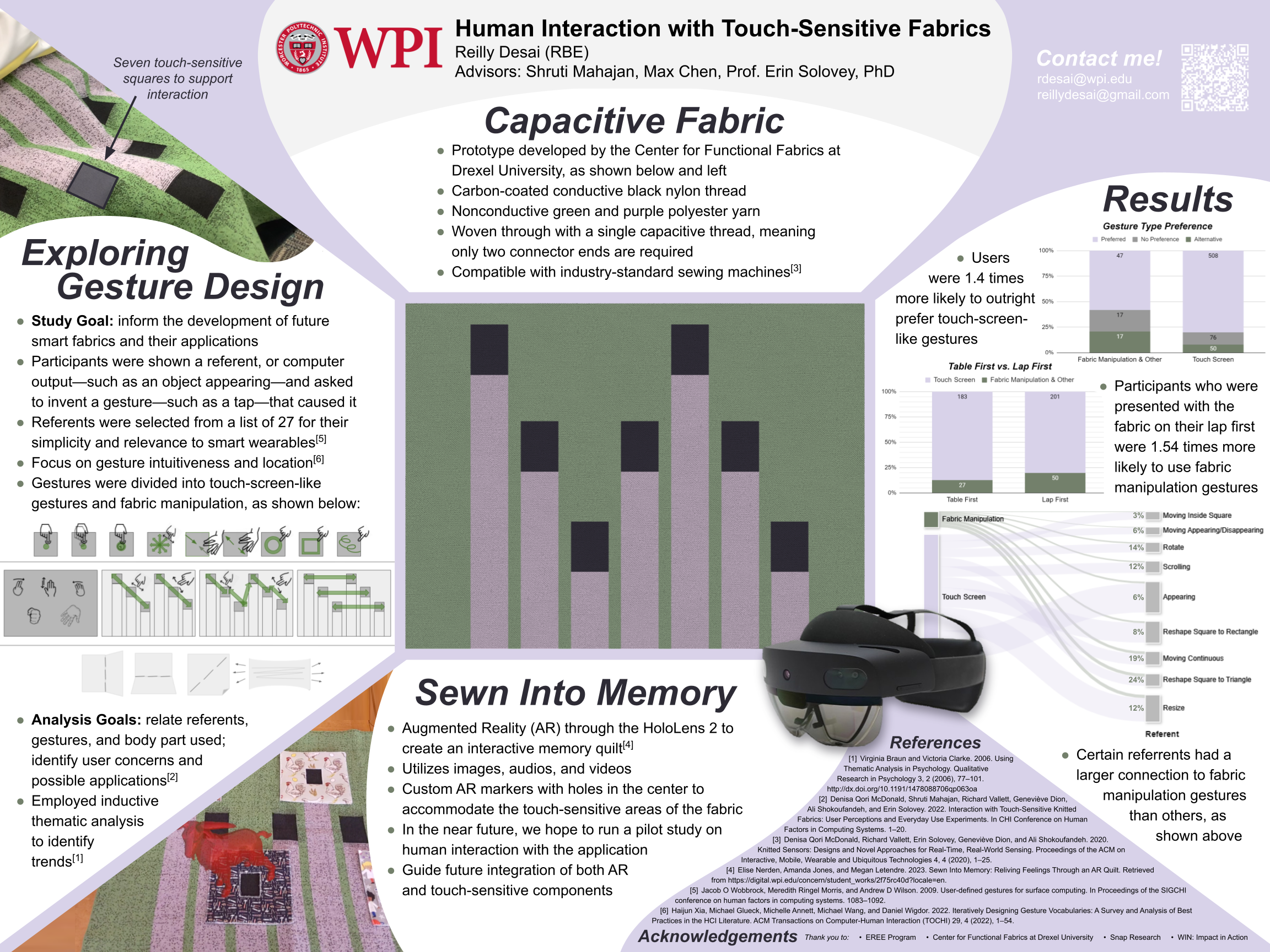 I spent the summer after my freshman year of college working in my school’s Human-Computer Interaction (HCI) lab. My work was funded by WPI’s EREE program (Early Research Experience in E-Term, basically a summer research program designed to get you the research experience you need to get hired elsewhere), which only had a 13% acceptance rate that year. Although HCI is not my primary discipline, it was a wonderful experience I am extremely grateful for. Working under Dr. Erin Solovey and her PhD students gave me invaluable insight into what academic research really looks like, and set me on a path to potentially pursue a career in research myself. Even if I go a different direction, most tech projects can greatly benefit from an HCI outlook, since it is a data-driven approach to considering the needs and wants of the end user, as well as measuring the project’s effectiveness after prototype production. The project I worked on focused on a capacitive fabric prototype from Drexel University. The fabric uses a single carbon-coated conductive nylon thread to add the touch-sensitive functionality, with a mapping algorithm to tell at exactly (x,y) position it was touched. The rest of the fabric was made with green and purple non-conductive polyester yarn. The spring before, the PhD candidate I was primarily working under, (now) Dr. Shruti Mahajan, ran a study exploring gesture design. Using a paper rectangle and a Mickey Mouse cut-out, she led participants through a series of referents (for example, Mickey moving from one part of the screen to another) and asked them which gesture they would do to cause that. My favorite example, having grown up with early-2000s Disney Channel, is that to make Mickey appear, one participant drew the Mickey Mouse ears with her finger. Shruti would go through all of the referents with the fabric on the lap and table, alternating which one was shown first to each participant. The neat part: the fabric acts as more than just a touch-screen. You can also fold it, stretch it, twist it—you name it! Future prototypes will be able to accept all sorts of inputs, and we wanted to figure out which ones users want and when. My job was then to analyze all the data. But first, I had to collect it. I was handed a video recording for each participant, then I used ATLAS.ti to code (sticky note) timestamps in the video with the referent, gesture, and body part(s) used. Many, many hours later, I transferred that data into Excel and went to work. I employed inductive thematic analysis, which, in simple terms, just means you look at the data and then look for themes in it, as opposed to starting with boxes you want the data to fit into and then sorting it into them. This is a more data-driven approach, which is perfect for a study like this. Please refer to my poster below for some of the results—they’re quite fascinating! As a side project in the lab, I worked on retooling a previous senior capstone project that used augmented reality (AR) to create an interactive memory quilt on the fabric. The exposure it gave me to the HoloLens led me to be hired on another project for the upcoming semester, where I handled the deployment and recording features (including writing my first C# script) for an AR application for electricians. The project partnered with Schneider Electric, who wanted their employees to be able to see the readings (voltage, current, etc.) of what they were working on in real time while being completely hands-free. I did quite a bit of prep-work for an eventual study before I left the project, as well as provided my input as the only member of the team with an engineering background (which is the nice way of putting, “the only person who even knew what units you use for the metrics, let alone what they mean”). This project really pushed me beyond my comfort zone, and helped me improve at teaching myself new systems. I definitely didn’t become an expert in anything, certainly not when I was using such in-depth platforms such as Unity, but in that discomfort I became a much stronger and more versatile programmer. |